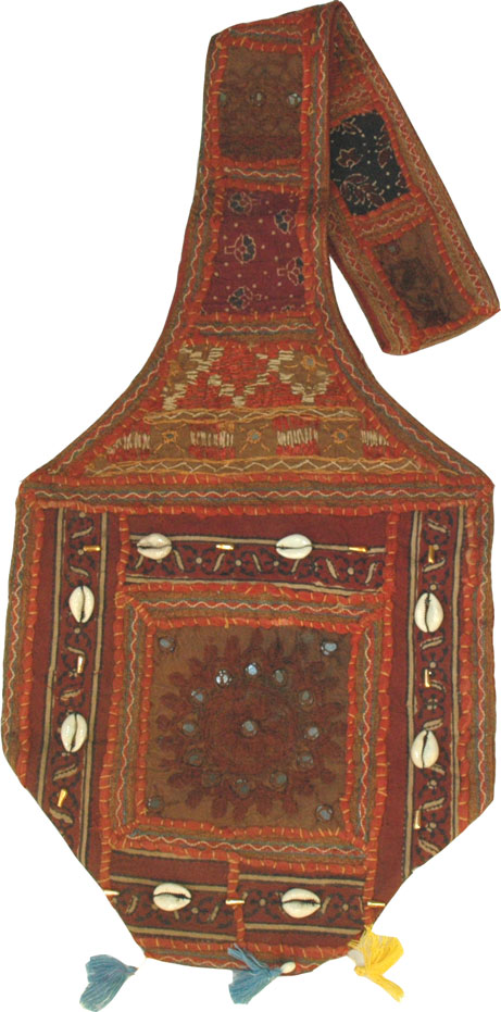 More details There is similar embroidery is on the front, back and strap. Closes with a string on the top. Highlighted with multicolor tassels and shells. Inner lining on the entire purse is black cotton.