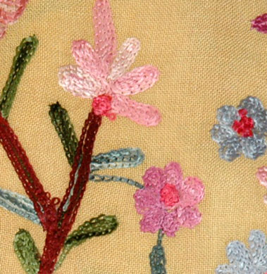 Kashmiri shawl with chain stitch embroidery in orange, pink, green and brown thread. The embroidery is on the 2 shorter edges. It has fringes on the shorter edges.