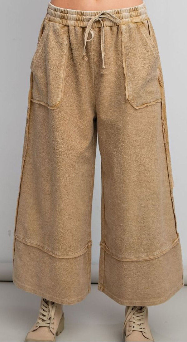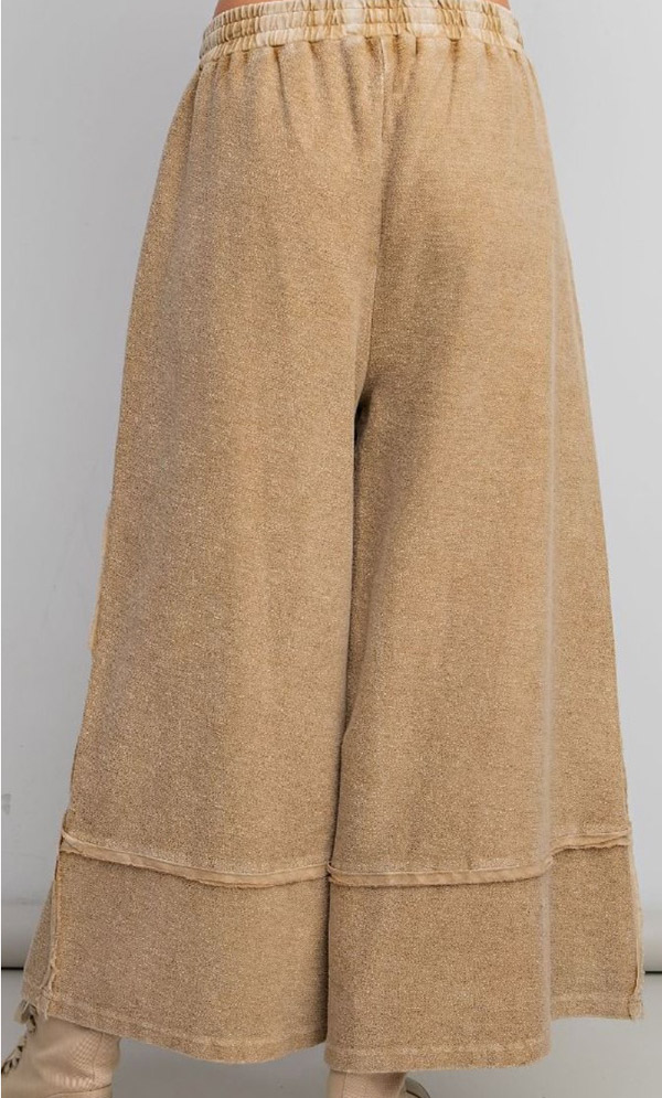 These pants are crafted from soft, mineral-washed terry fabric, offering a cozy and relaxed fit. The wide-leg palazzo style is enhanced by front pockets and double-side seam detailing, creating a defined yet loose silhouette. The exposed seams add texture, while the drawstring waist ensures adjustable comfort. The muted beige tone complements the casual design, making these pants ideal for lounging or casual outings. Pair with a simple top or a bohemian blouse for a laid-back look that is perfect for errands, going on an adventure, or just a lazy day on the couch.