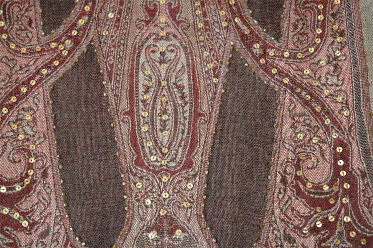 Trendy and Stylish Shawl/Stole Wrap in MaroonThis is a very delicate and exquisite Shawl/Stole which can also be used as a Scarf. It is predominantly maroon with grey and black in woven paisley pattern (see picture). It is accented by round dull golden sequins which have been hand sewn into the fabric these sequins shimmer when light falls on them (see detailed picture). It has fringes on the shorter edges. The fabric on this stole is extremely soft and smooth to touch and drapes very well. This particular stole is perfect evening wear for a formal occasion with slacks or when a simple stylish dress .