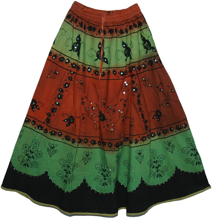 Tie Dye Long Goblin Green and Cognac Rust Brown Skirt with Sequins