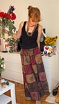 The cotton patchwork wide-leg boho pants feature a relaxed fit with a comfortable elastic waistband and drawstring tie made from handwoven cotton. These pants showcase a whimsigoth-inspired patchwork design in earthy brown, maroon, green, and muted mustard. Each patch carries unique celestial and mystical symbols, adding to the eclectic, 90s-inspired trousers perfect for the bohemian or hippie fashion lover. Pair with a simple tank top or crop top to balance the bold pattern, and complete the look with sandals or boots for a stylish, laid-back vibe.