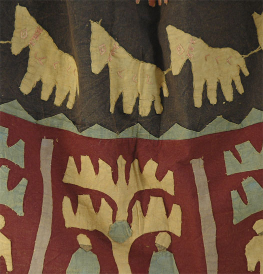 This is a heavy bohemian boho long skirt. The base color is brownish black. It is fully covered with hand stitched animal shaped patches in biege, orange and blue with contrasting threads. Marked by a 10" border in maroon with patchwork in similar colors. All the patchwork done exclusively by hand which gives this skirt a unique character (see detailed picture below). - Length: 38"