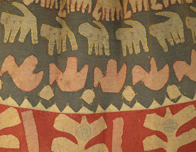 This is a heavy bohemian boho long skirt. The base color is brownish black. It is fully covered with hand stitched animal shaped patches in earthy tones and with contrasting threads. Marked by a 10" border in maroon with patchwork in similar colors. All the patchwork done exclusively by hand which gives this skirt a unique character (see detailed picture below). - Length: 38"