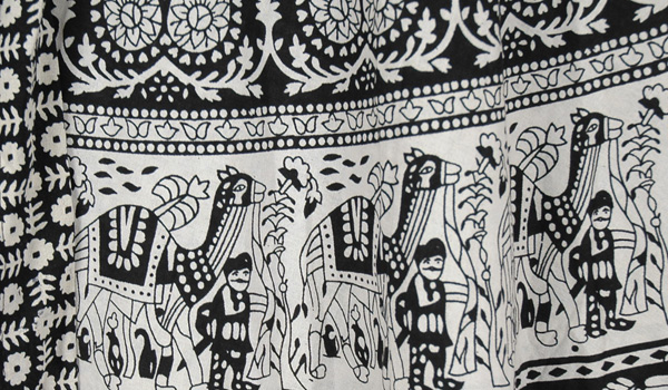 A black and white block print wrap around skirt that seems to depict stories from the Mughal era with camels, elephants, pitchers and flowers.This is a wrap around skirt so it goes around the waist and is tied on the side. You could also get creative in wearing it. The material is nice, with a flattering hemline. As the summers set in the demand for anything cotton, anything easy on the eye and the skin and anything manageable is always on the go. Light and flowy cotton in the form of these skirts is a welcome sight.