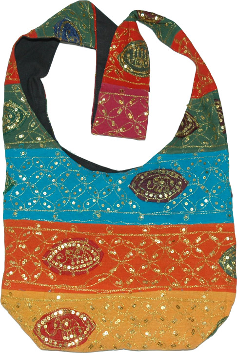| Item Style | College Shoulder Sling Bag | | Material | 100% Cotton | | Colors | The dominant colors are blue, orange and yellow(see picture). | | Measurement | Depth 11" width 15". Strap is 40" long and 3" wide | | More details | Patchwork with intricate hand embroidery with golden threads interlaced with golden sequins. There is similar embroidery on the front and back and also on the strap. It closes with a zipper on the top. Inner lining on the entire purse is black cotton. Bag holds good volume and is ideal for travel. Easy to open and close. | |