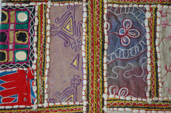 | Item Style | Casual Shoulder Sling Bag | | Surface | Patchwork with intricate hand embroidery interlaced with mirrors. | | Material | 100% Cotton | | Colors | Multicolor(see picture). | | Measurement | Depth 12" width 13". Strap is 34" long and 2" wide | | More details | There is similar patchwork and embroidery on the front and back and also on the strap. It closes with 2 strings on the top. Inner lining on the entire purse is black cotton. | |