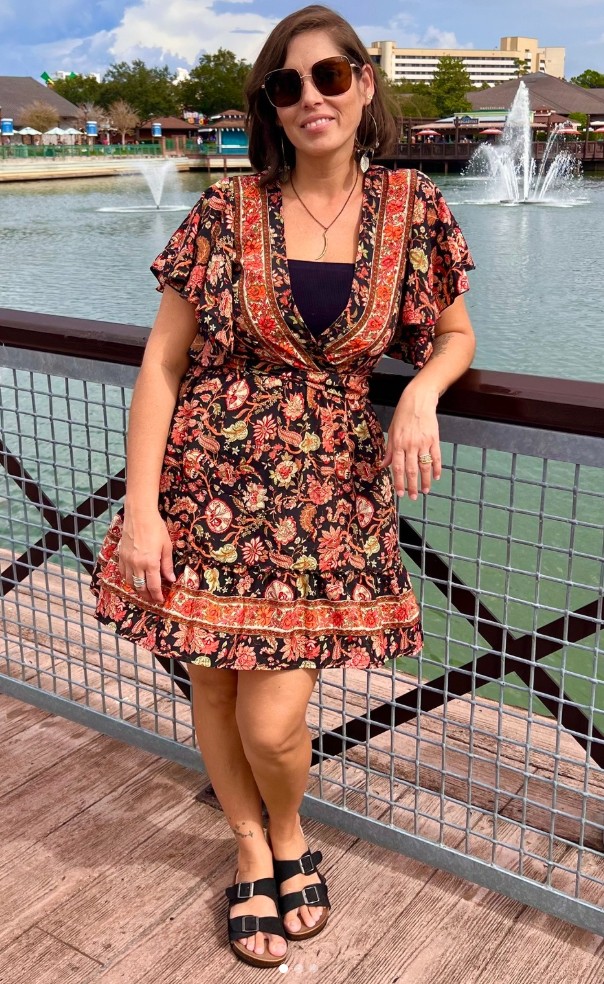 A fairy dress for all the pretty ladies, this skater dress is a classic with short bell or butterfly sleeves (the sleeves are spread out to illustrate the pattern, in reality, they will fall on the shoulder). With its all-over floral print in colors such as red, beige, and black, it is a unique combination. The red and beige floral stripe just below the neckline and above the hem gives it a characteristic look. Give yourself a confidence boost with its fit and flare style and bell sleeves. The empire-cut dress suits all and is very flattering. Pair it with a nice pair of heels and a hat for a perfect vacation look! You can wear it for a local trip or even for a cross-country cultural adventure!