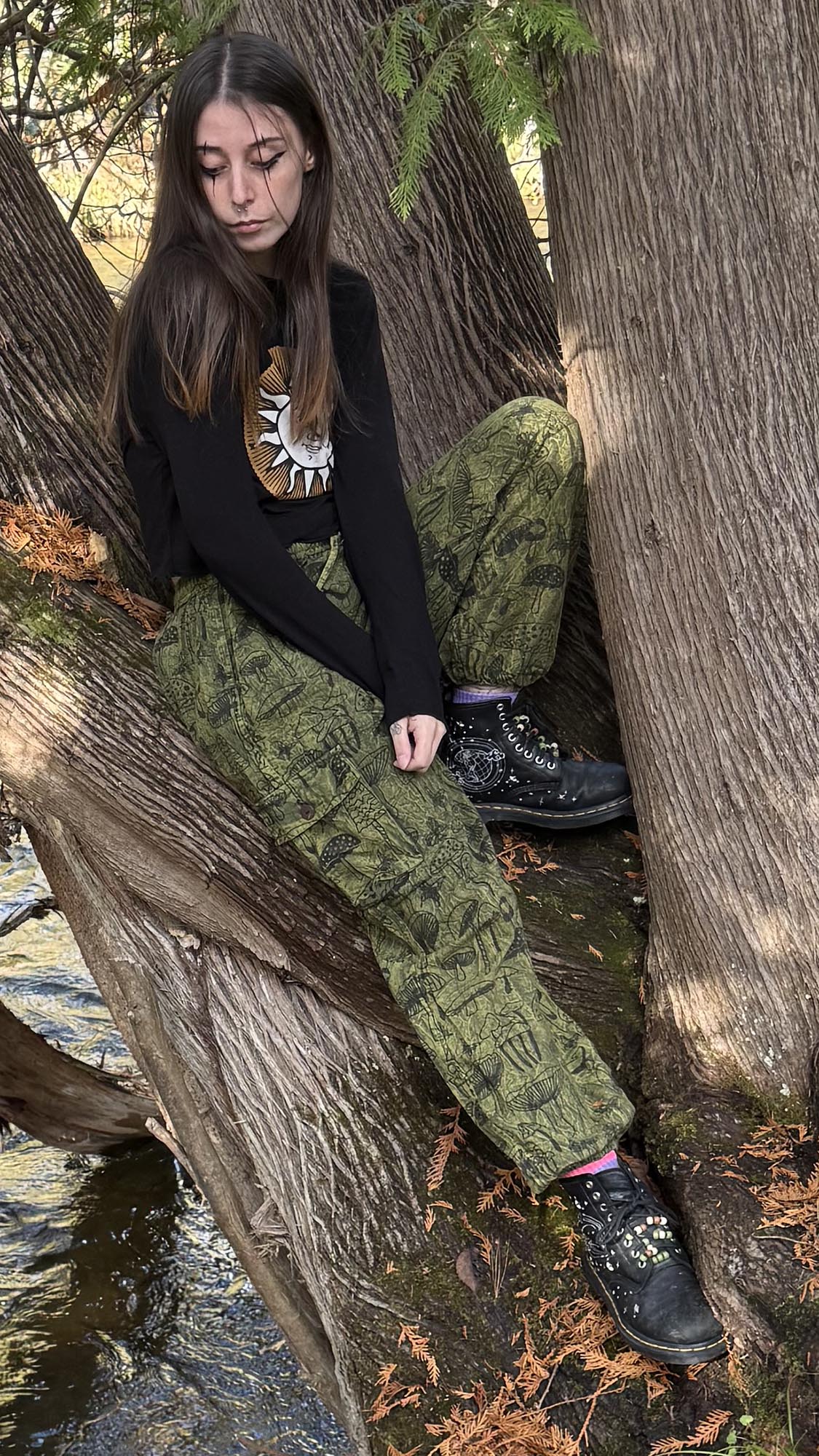 Relaxed-fit cotton bohemian cargo pants featuring an all-over mushroom print in earthy green and black shades. The pants are made from soft, breathable cotton fabric that offers a comfortable and loose fit, making them perfect for everyday wear or casual outings. They feature an elastic waistband with a drawstring for an adjustable fit and multiple pockets for added functionality. The intricate mushroom patterns add a unique, artistic touch to the garment. Pair these pants with a simple tee or tank top for a relaxed, stylish look suitable for festivals, beach days, or laid-back weekends.