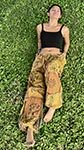 These relaxed-fit harem pants are crafted from alternating woven and knit cotton panels, giving them a textured and patchwork appearance. The blend of earthy tones, featuring brown, tan, and muted stripes, creates a rustic, bohemian aesthetic. The pants are one-size-fits-all, with a gathered elastic waistband for comfort and loose, tapered legs with elastic at the cuffs. Hand-printed symbols, including celestial motifs, lions, and trees, adorn the fabric. The pants feature two front pockets for convenience. Perfect for pairing with a simple top and sandals for casual outings, festivals, or laid-back gatherings.