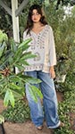 This long-sleeve top is made of soft rayon fabric, featuring intricate floral embroidery crafted by cottage industry artisans. It has a relaxed, comfortable fit with a one-size design that suits a variety of body shapes. The embroidery includes delicate red, green, and white floral patterns along the neckline, sleeves, and hem, adding a touch of vintage charm. There is a tie strap at the back for fit flexibility. The neutral beige background enhances the intricate needlework, making it versatile and easy to pair. Perfect for casual outings, festivals, or relaxed daywear, it pairs well with jeans and skirts.