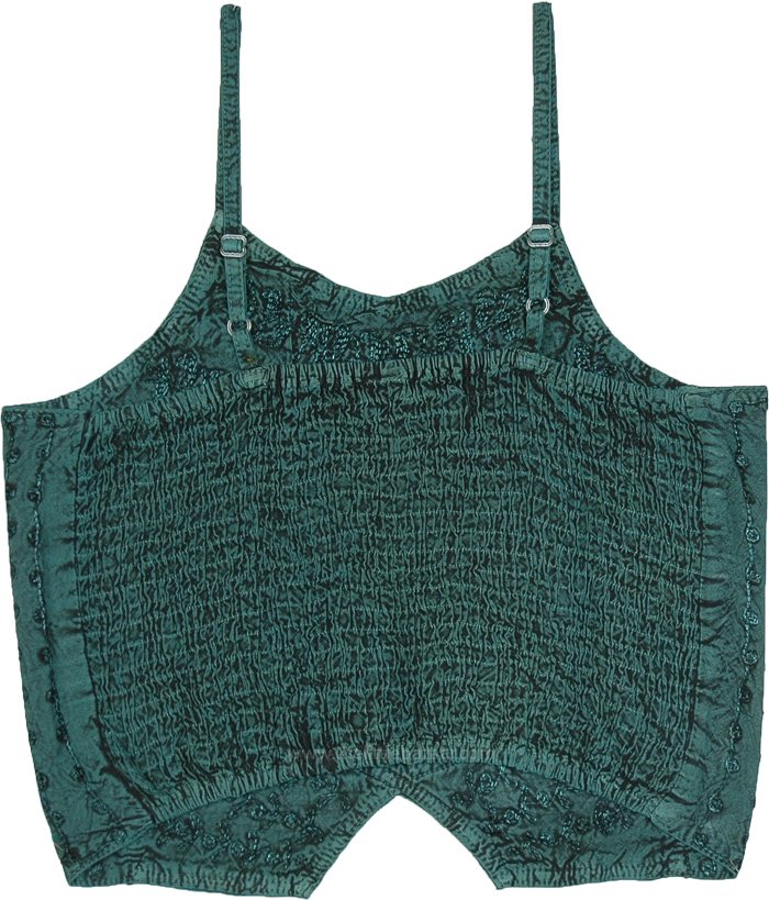 This is a sleeveless, heavy embroidered crop top made of soft rayon fabric. The intricate embroidery runs across the front, creating a detailed and textural pattern that adds depth and character. The back features a full smocked elastic panel for a comfortable, flexible fit, making it easy to wear and adjust. The spaghetti straps are thin yet durable, providing support while maintaining the top's airy, bohemian feel. The rich green color enhances the garment's artistic embroidery, making it an excellent choice for a casual day out or a special occasion. Pair this top with high-waisted skirts, jeans, or shorts for a relaxed, bohemian look perfect for festivals, beach outings, or casual social gatherings.