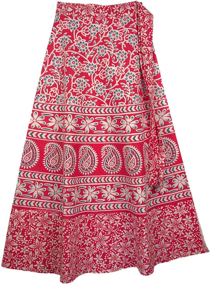 Cotton Long Skirt With Wrap Waist. Awesome purple and red white cotton wrap skirt. Perfect for spring or early fall because of the thick cotton weave. The wrap design provides sizing flexibility. This long wrap around skirt has a combination of interesting star dyes and fun colors. There is wide floral pattern in bleeding white. Its just all very beautiful. This is a wrap around skirt so it goes around the waist and is tied on the side. The material is thick heavy cotton.