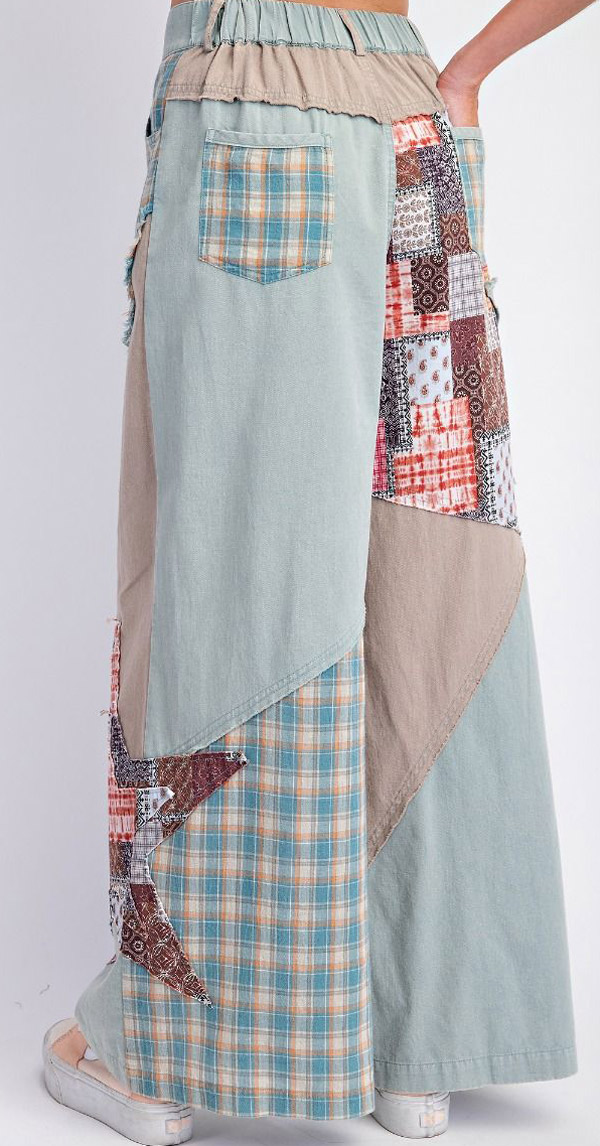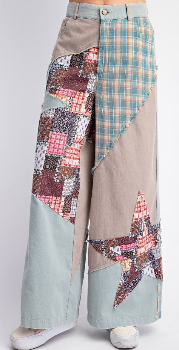 Wide-leg washed pants featuring a unique mix-and-match patchwork design with raw cut and frayed seams for a relaxed, artistic look. The patterned star patch details and contrasting prints add visual interest, while the button and zip closure, belt loops, and ruched back waistband ensure a comfortable fit. Functional front and back pockets provide practicality, and the lightweight material makes these pants perfect for casual, bohemian-inspired outfits. Pair them with a solid top or oversized sweater for a relaxed day out or a festival-ready look.