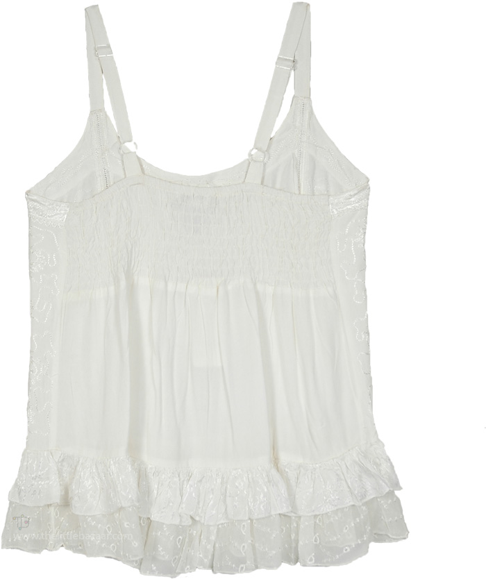 This tank top is made from soft rayon in pure white. The scoop neckline features adjustable spaghetti straps, providing a customizable fit. The bodice showcases intricate paisley embroidery, accented with tubular sequins throughout. The back incorporates flexible smocking, providing stretch and ease of movement. The flared hemline transitions to gathered georgette fabric trimmed with eyelet detailing, creating a romantic silhouette.