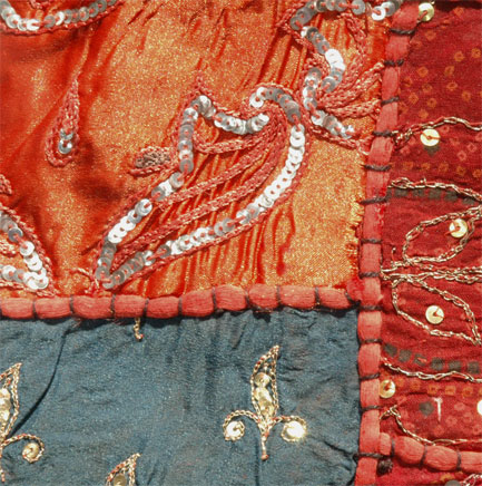 Surface Multicolor Patchwork with intricate hand embroidery with golden and silver threads interlaced with silver and golden sequins.