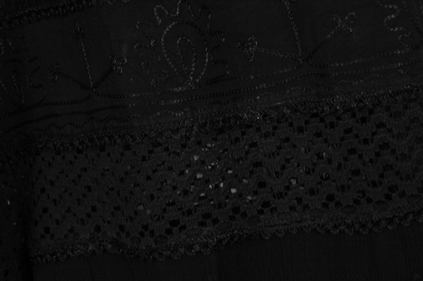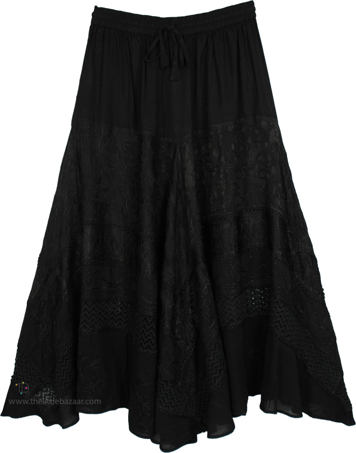 A detailed layered skirt in black with elaborate stitching and accent throughout. A flowy combination of sheers, opaque and solids. A very classy western rodeo skirt in an all year around popular color. This viscose skirt features a great fall with an elastic waist and a free-flowing fit around the hips for a comfortable fit. This skirt features a slight handkerchief-style hem and a slimming V-panel design on the lower section. Simply elegant, this very feminine skirt is a distinct reminder of old-time western skirts with a hint of Renaissance influence. Ideal to wear at work or out in the evening, dress up or down with accessories. The skirt can be worn with a camisole or corset top and goes well with boots.