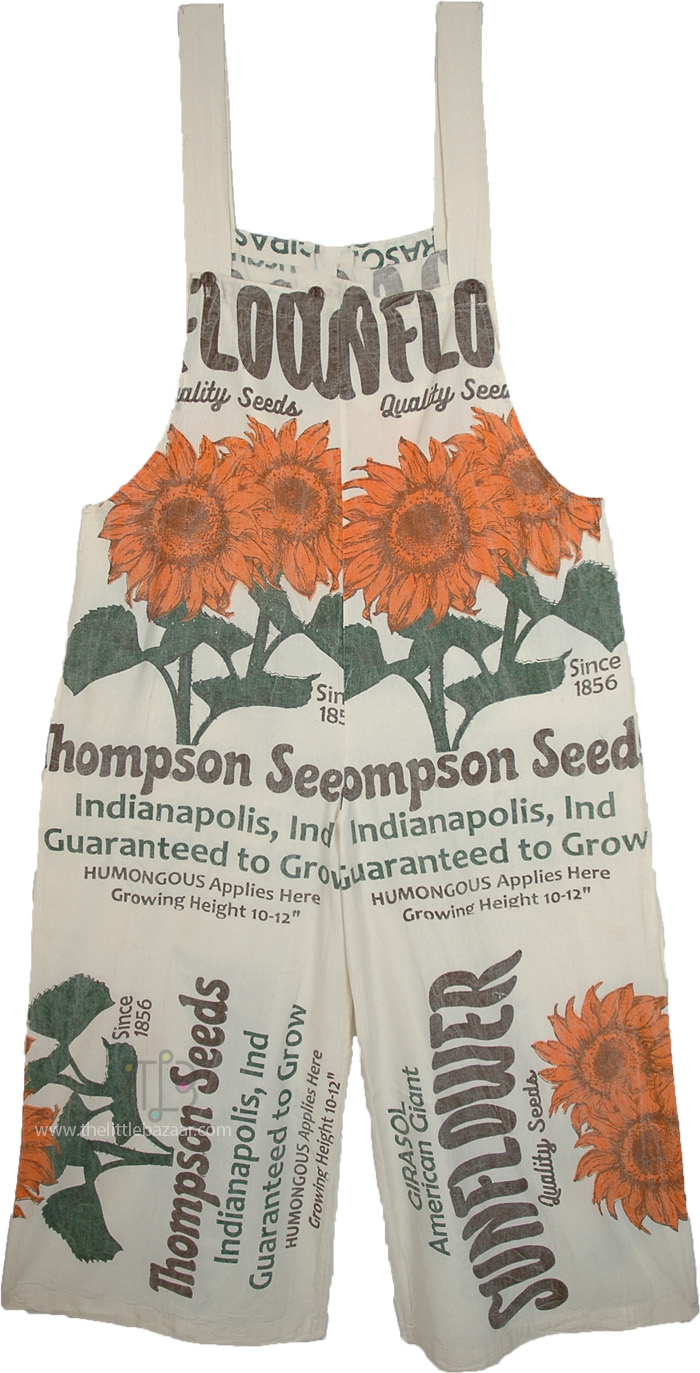 Reminiscent of an era bygone, these cotton overalls feature a vintage sunflower seed sack print with "Thompson Seeds" graphics in orange and brown tones. The originals were perhaps made with real rice sacks. They are made from 100% cotton canvas like fabric with a relaxed, loose fit and wide-leg silhouette. The distinctive print showcases illustrated sunflower throughout with text indicating "Indianapolis, Ind" and "Quality Seeds" details. Cream-colored shoulder straps provide comfortable support. These lightweight overalls pair perfectly with simple t-shirts or crop tops for casual summer outings, festivals, or creative workspaces. Machine washable.