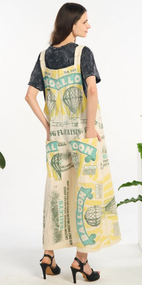Reminiscent of an era bygone, these loose-fitting cotton overalls feature a unique print combining vintage flour sack prints with hot air balloon illustrations. The wide-leg silhouette provides comfortable movement, featuring adjustable shoulder straps and two oversized back pockets for practical storage. Constructed from cotton fabric, the garment displays authentic vintage branding, including Bailey's Self-Raising Flour text and Roland Milling Co. Philadelphia details. The color palette blends cream base tones with yellow striped sections, teal blue accents, and black line drawings of hot air balloons and rural landscapes. Various flour company logos and agricultural imagery create an authentic vintage feed sack aesthetic. Style with simple fitted tops, canvas sneakers, and denim jackets for farmers markets, outdoor festivals, or casual weekend activities. The nostalgic print adds character to everyday bohemian styling.