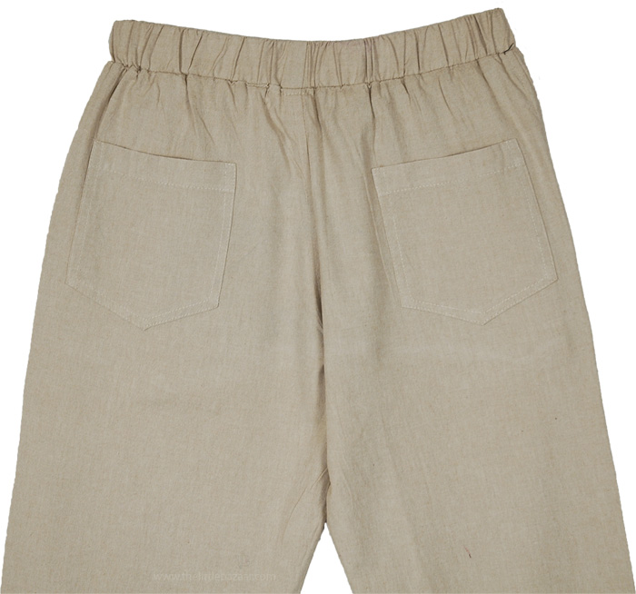 Pull-on pants crafted from a pure cotton-linen blend in a natural oatmeal tone'low-rise silhouette with relaxed, straight-leg fit and elastic waistband for easy dressing. Functional side pockets and back pockets provide convenient storage. Lightweight, breathable fabric suitable for warm weather wear. Neutral color works with various tops for versatile styling. Soft, comfortable construction ideal for loungewear, casual home wear, or travel. Pairs with tank tops, t-shirts, or crop tops for relaxed daytime comfort or bedtime wear.