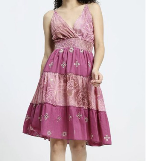 Short skater dress in a Turkish rose color cotton-polyester blend featuring a V-neckline with adjustable straps and an empire waistline. Gold metallic thread embroidery adorns all tiers with ornamental circular patterns, floral designs, and decorative embellishments. Smocked detailing at the empire waist adds structure. Lightweight construction allows graceful drape.