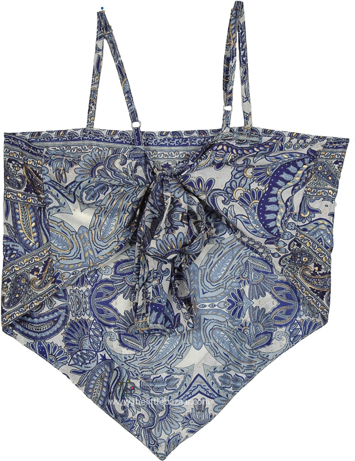 This one-size silk polyester crop top features adjustable thin straps and a tie-back closure for a customizable fit. Chic and flirty, this floral strappy top combines smooth satin-like fabric with a tie bandana style for a versatile, on-trend look. The bandana-style construction creates a pointed hem at the front, while ornate border patterns frame the entire piece. Traditional paisley motifs are arranged in a symmetrical layout with decorative flourishes and botanical elements. The cropped length sits at the midriff, offering a flattering silhouette. This versatile top pairs beautifully with high-waisted jeans, flowing skirts, or layered over tank tops for festivals, beach outings, or casual summer gatherings where bohemian style is desired.