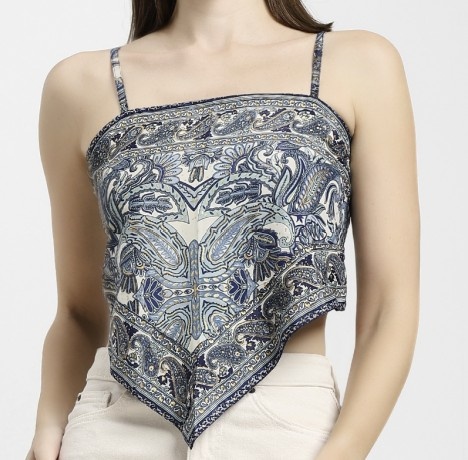 Satin feel polyester crop top with adjustable straps and paisley bandana print