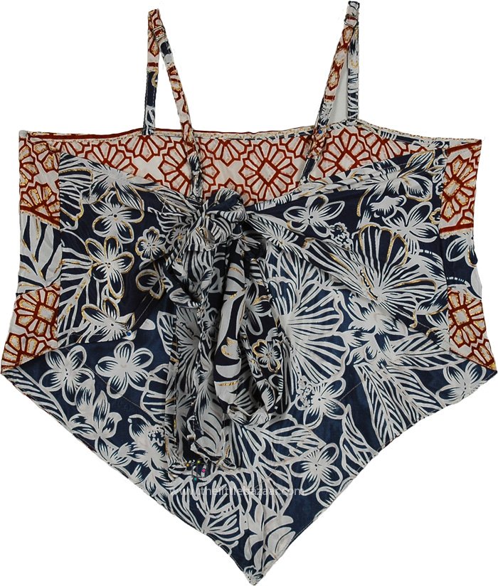 This handkerchief-style halter top features a pointed hem silhouette crafted from lightweight cotton fabric. The design combines two distinct batik prints: rust-orange geometric patterns frame a navy blue center panel with cream tropical floral and leaf motifs. Adjustable neck ties offer a customizable fit and secure fastening. The contrasting prints create visual interest while maintaining cohesive color coordination. The cropped length and open back design provide breathability for warm weather. Pair with high-waisted shorts, denim, or flowing skirts for beach outings, summer festivals, or casual weekend wear.