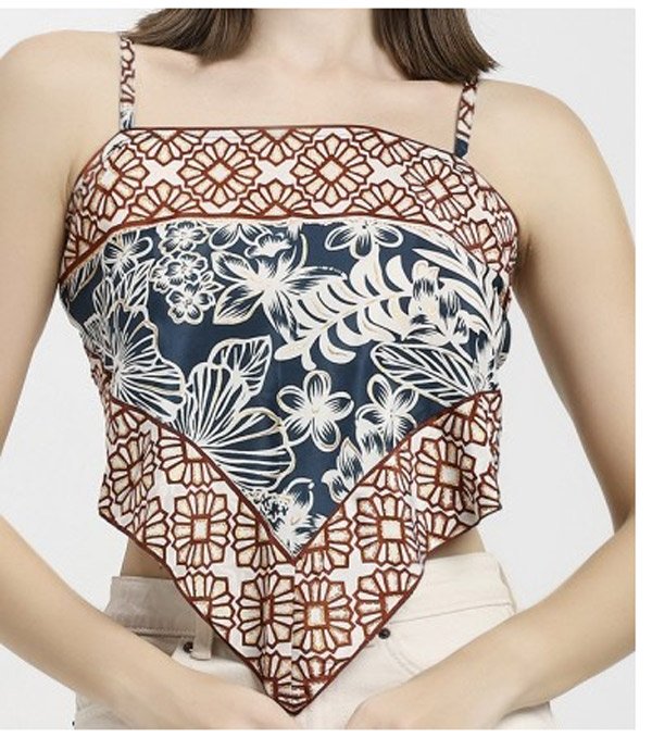 Silk polyester crop top with adjustable straps and paisley bandana print