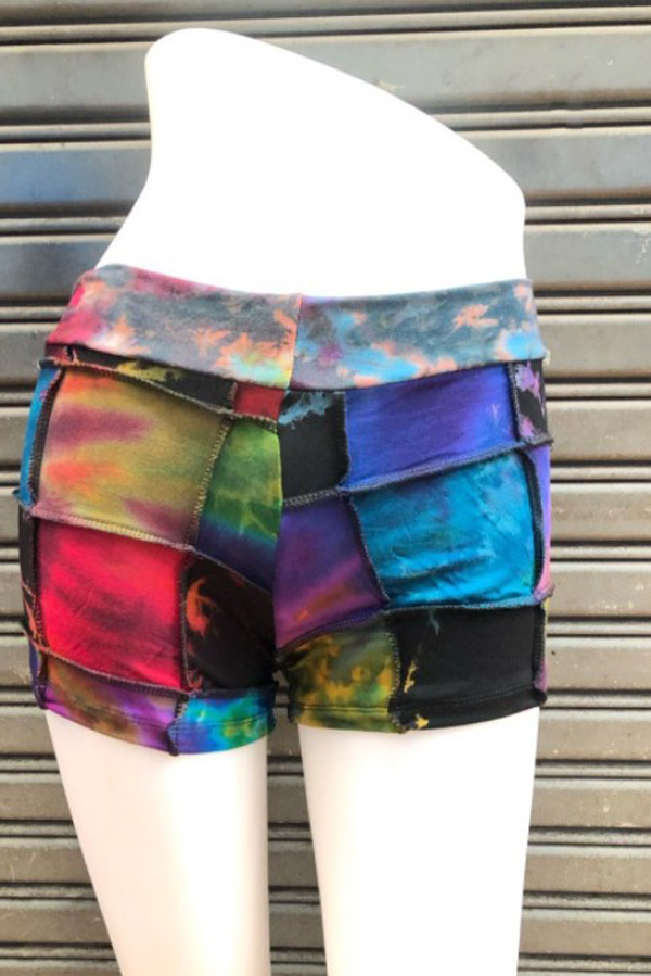 These one-size boy shorts feature handmade construction in stretchy spandex and rayon blend fabric. The patchwork design uses tie-dyed panels joined with reverse seam stitching visible on the exterior. The wide waistband provides comfortable coverage. Colors include vibrant royal blue, turquoise, red, orange, yellow, purple, green, and black, swirling in tie-dye patterns across different patches. The fitted silhouette offers flexible stretch. Pairs well with sports bras for yoga, dance classes, festivals, or beach activities.