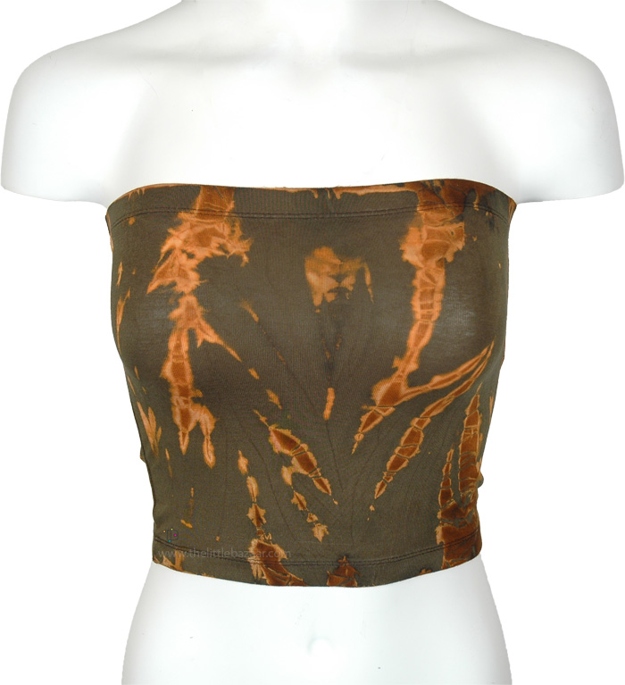 This strapless bandeau tube top is crafted from a stretchy rayon-spandex blend with a cropped, form-hugging fit. This is a standard-length bandeau that covers the bust and reaches just below, revealing a significant amount of midriff. It covers the bust area well and extends toward the natural waistline, making it suitable as a standalone top rather than just a layering piece or bralette. The stretchy fabric allows the length to vary slightly, depending on how it's worn and the wearer's torso length. The structured design features a straight square neckline and snug, secure construction. Hand-dyed mudmee tie-dye pattern displays olive green base with rust orange and golden brown streaks throughout. Pair with high-waisted jeans, maxi skirts, or festival pants for concerts, beach days, and summer parties.