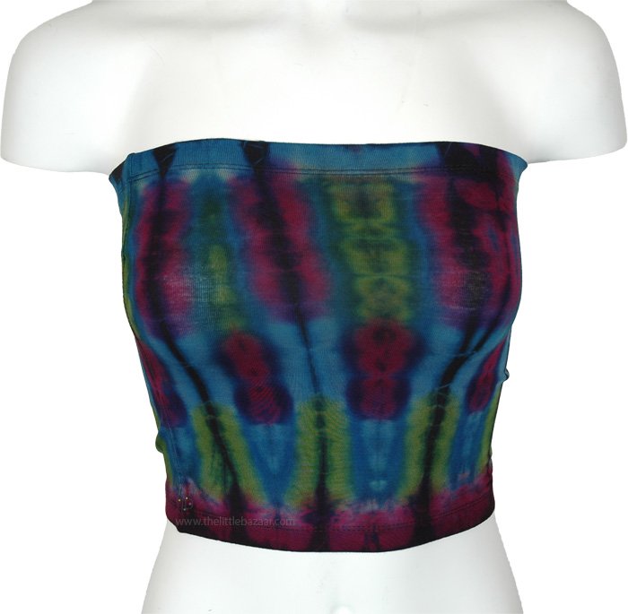 This strapless bandeau tube top is crafted from a stretchy rayon-spandex blend with a cropped, form-hugging fit. This is a standard-length bandeau that covers the bust and reaches just below, revealing a significant amount of midriff. It covers the bust area well and extends toward the natural waistline, making it suitable as a standalone top rather than just a layering piece or bralette. The stretchy fabric allows the length to vary slightly, depending on how it`s worn and the wearer`s torso length. The structured design features a straight square neckline and snug, secure construction. Hand-dyed mudmee tie-dye pattern showcases a vibrant turquoise blue base with bold magenta, deep burgundy, and lime green. Pair with high-waisted jeans, maxi skirts, or festival pants for concerts, beach days, and summer parties.