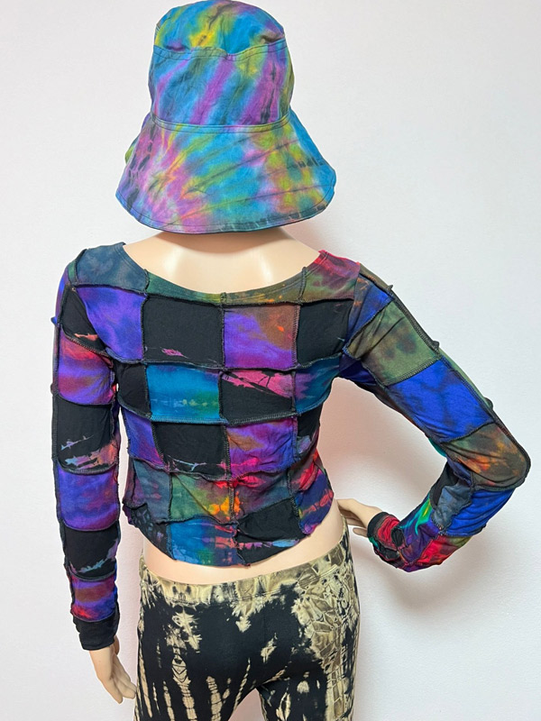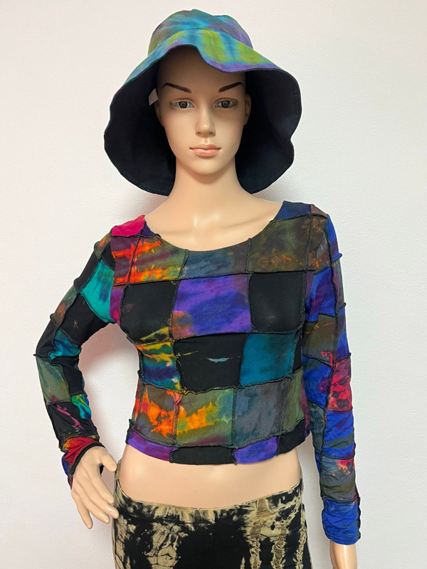 One-size rayon spandex crop top with square tie-dye patches and reverse seam stitching