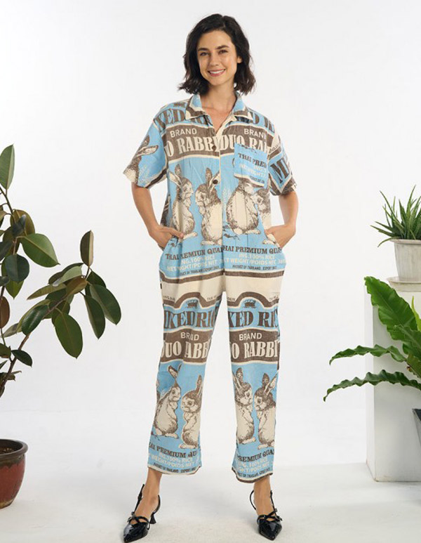 Reminiscent of an era bygone, these cotton overalls feature a vintage rice sack print with "Brand Duo Rabbit" graphics in light blue and brown tones. The originals were perhaps made with real rice sacks. They are made from 100% cotton canvas-like fabric, featuring a relaxed, loose fit, wide-leg silhouette, collared neckline, short sleeves, and button-front closure. The distinctive print showcases illustrated rabbits throughout with text indicating "Thai Premium Quality" and "100% Rice" details. Cream-colored shoulder straps provide comfortable support. These lightweight overalls pair perfectly with simple t-shirts or crop tops for casual summer outings, festivals, or creative workspaces.