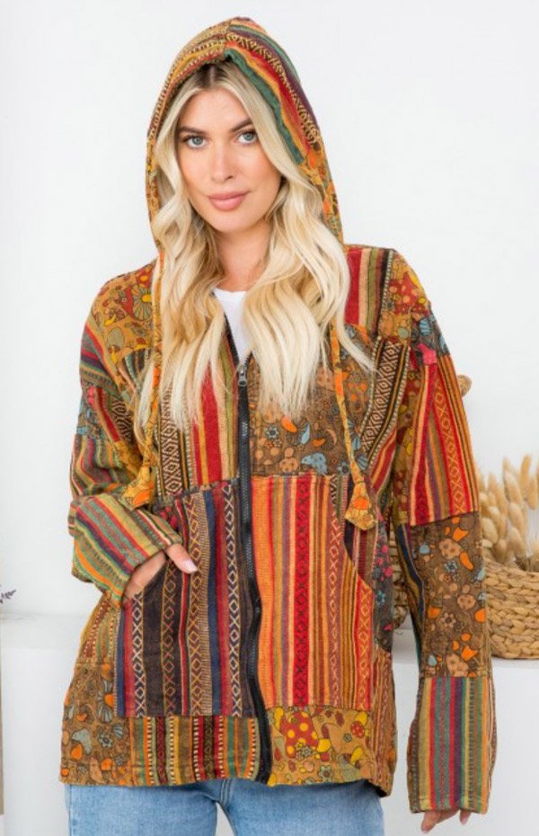 This zip-front hoodie jacket features vibrant patchwork construction in 100% thick woven cotton fabric with long sleeves and an attached hood. The design combines vertical and horizontal panels in contrasting patterns, including ethnic-inspired stripes with geometric motifs, bold floral prints on mustard and olive backgrounds, and multicolored botanical designs. Colors include warm earth tones like olive green, burnt orange, mustard yellow, rust red, navy, and teal, with pops of bright florals throughout. The eclectic mix creates a festival-ready aesthetic. Pairs well with jeans, leggings, or solid-colored pants for outdoor concerts, casual gatherings, or layered autumn styling.