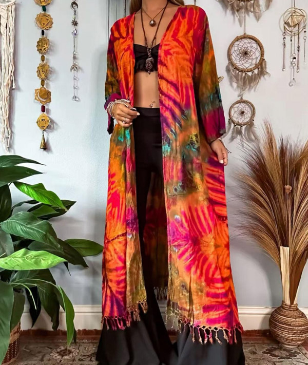 Hippie Robe Long Jacket Hand Tie-Dyed with Tassel Hem