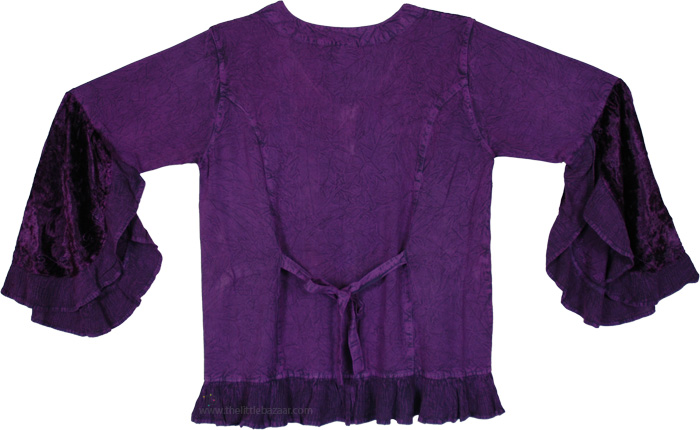 Mid-hip length rayon and velvet top in deep amethyst with trumpet bell sleeves and ruffled hem. Crushed velvet adorns the front bodice and sleeves with intricate ribbon embroidery in scrollwork patterns. Button-front closure with an adjustable back tie, pleated ruffle hem adds movement and texture.
