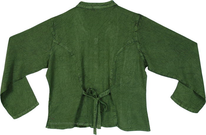 Waist-length rayon top in sage green with full-length sleeves, a semi-mandarin V-neckline, and embroidery and stonewashed fabric that provides soft, lived-in texture throughout. The front features alternating vertical velvet strips with hand-embroidered scrollwork in darker green and black, creating ornate detail down the center. Functional button closures and back tie drawstring allow adjustable fit for one-size versatility. Relaxed, slightly cropped silhouette flatters most body types.