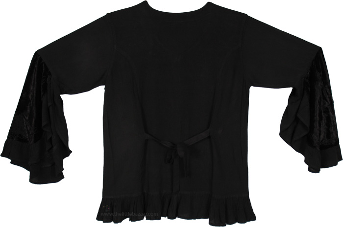 Mid-hip length rayon and velvet top in raven black with trumpet bell sleeves and ruffled hem. Crushed velvet adorns the front bodice and sleeves with intricate ribbon embroidery in scrollwork patterns. Button-front closure with an adjustable back tie, pleated ruffle hem adds movement and texture.