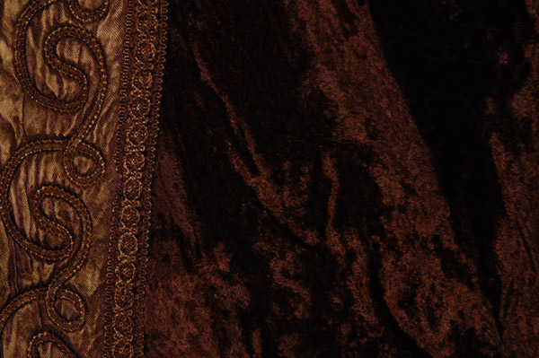 Asymmetrical hemline, open-front velvet kimono shrug in rich choco brown to cola, with a flowing duster silhouette to elevate a casual, everyday look. The luxurious crushed velvet body contrasts with ornate embroidered satin trim along the front edges and cuffs, featuring intricate scrollwork in complementary brown tones. Drapes gracefully for a flowy, flattering fit across most body types.