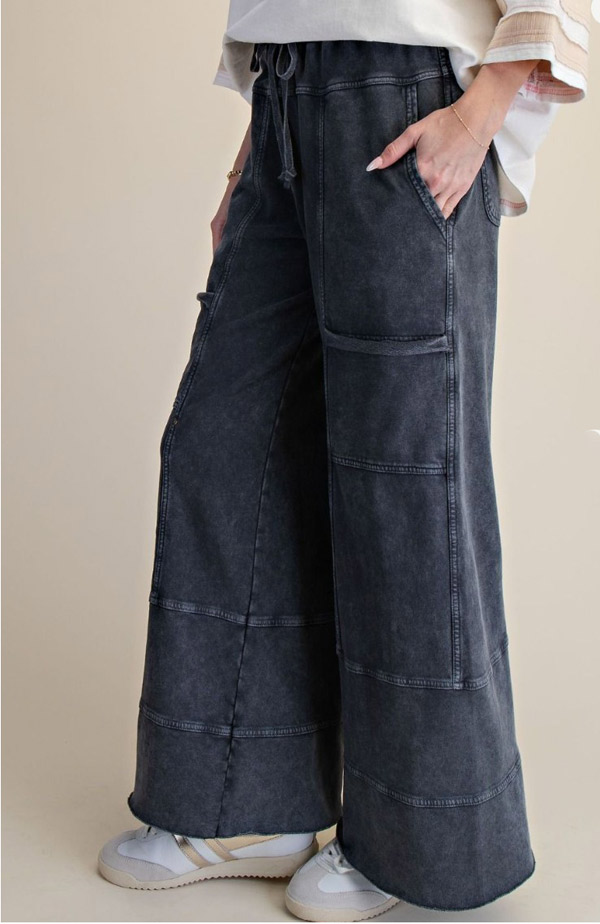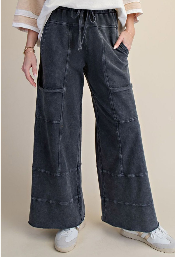 These washed-look terry knit pants feature a wide-leg design and a relaxed, loose fit for ultimate comfort. The elastic ruched waistband with an adjustable drawstring ensures a customizable and secure fit. Functional details include side hem pockets, back pockets, and cargo-style side pockets, offering ample storage. Exposed seams and a mineral-wash finish add a casual, textured aesthetic. The charcoal-grey mineral wash creates a vintage aesthetic. Pair with a simple t-shirt or tank for a cozy and effortless look.