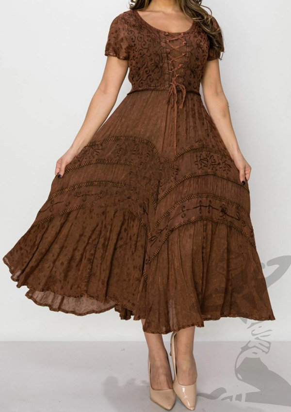 Medieval, renaissance, peasant style tea length dress in walnut copper brown