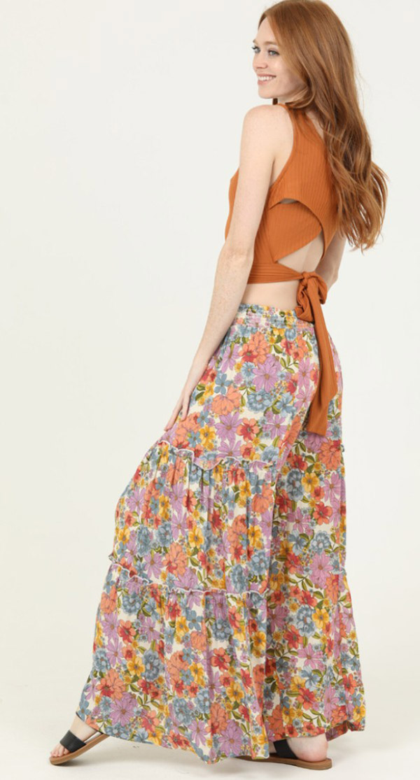 Rayon wide-leg pants with a smocked elastic waistband and two-tiered, ruffle-trimmed legs that flare to a full-length sweep. The fit is relaxed and roomy throughout. White ground with a dense, retro-style allover floral print in lavender, peach, coral, sky blue, amber, and olive green. Pairs easily with a fitted crop top or tank; works for warm-weather wear, festivals, or casual outings.