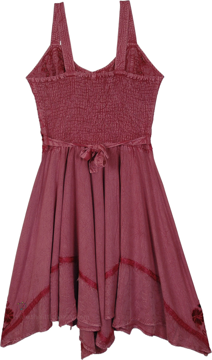Hand embroidered rayon dress in dusty rose with lace-up front, flared skirt, and handkerchief hem