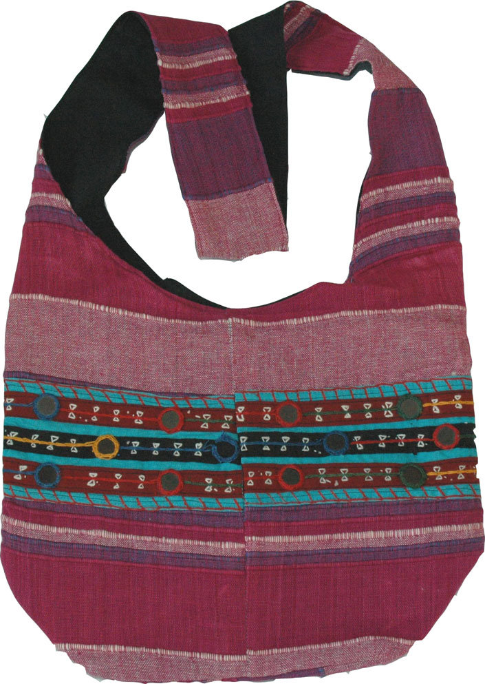 | Item Style | Casual Shoulder Sling Bag | | Surface | Hand Embroidery and Mirrors (see picture below) | | Material | 100% Cotton | | Colors | Dark pink with other colors. | | Measurement | Depth 11" width 14". Strap is 40" long and 3" wide | | More details | There is similar patchwork and embroidery on the front and back . It closes with a zipper on the top. Inner lining on the entire purse is black cotton. | |