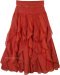 Midnight lack long gypsy skirt with a stretch foldover yoga waistband that flows into alternating vertical ruffles of crocheted lace and solid fabric, all in pure cotton fabric. The stretch knit waist panel can hug the torso, for a slimming look or fold down for a shorter look. Simply elegant, this very feminine skirt is a distinct reminder of the old-time eastern skirts with a hint of the Renaissance. Multiple spiral frills add volume to this beautiful, lush, swirling skirt with handkerchief hemline. The skirt can be worn with a camisole or corset top and goes well with western boots. Contemporary design in casual comfort, this skirt embraces you effortlessly in a chic look. This skirt is not lined.