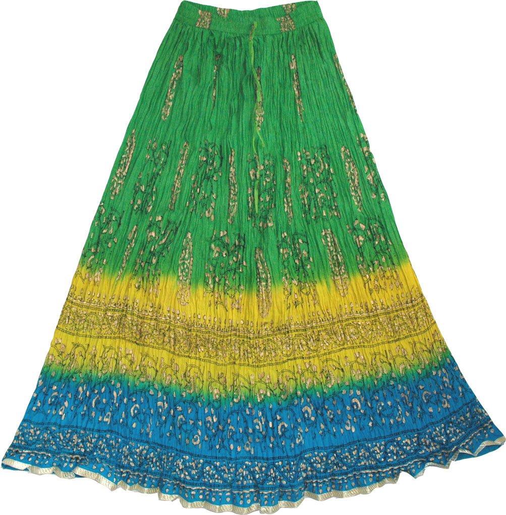 The exotic allure of 1001 Nights comes alive in this exquisite skirt dances like magic with every move you make. This long crinkle skirt has bright summer shades of green, yellow and blue with black and golden batik print and paint. And a golden ribbon encircling the hemline. This skirt is made to celebrate the princess in you (see detailed picture below). This is beautiful alternative to jeans and trousers this season. Top it with a sexy cami and it gives you a designer flair with distinctive elegance. - Length: 39"