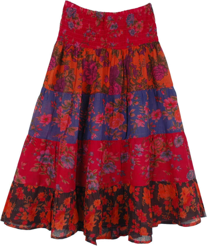 A country girls skirt with four tiers together in multicolor - pink, blue, orange, black. A floral printed cotton panel patchwork skirt for young girls - 100% cotton fun pull-on skirt with a smocked elastic waist for flexibility, fit and style. The mixed patchwork style adds to the versatility of this stylish skirt, allowing it to be paired with a solid casual or fancy top and bold accessories. Made of cotton, the skirt is are airy and comfortable. The panel prints are an eclectic combination of florals, with petals in pink, purple, blue, orange. Available in two sizes - but elastic and smocking allow for a pretty wide sizing range.