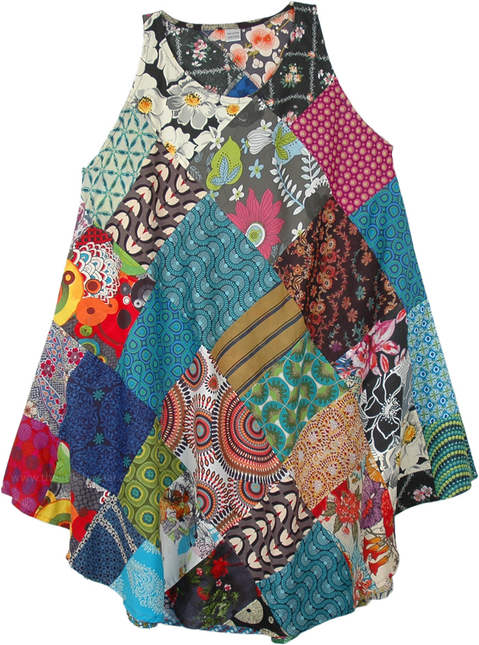 A multicolored mixed patchwork sleeveless dress with breathable 100% cotton fabric is all you need this summer to soothe your bohemian soul. An easy casual pull-over style summer dress is so unique, elegant and cute, it can be dressed up or down and is loose and slightly flared to give it a flowy summery look. This cool dress is perfectly versatile; soft cotton fabric style is always swinging and extra flattering. You will want to wear this dress almost every day. The silhouette begins at your shoulders and flairs out over your form. It has an easy, breezy, almost tent-like look and feel.