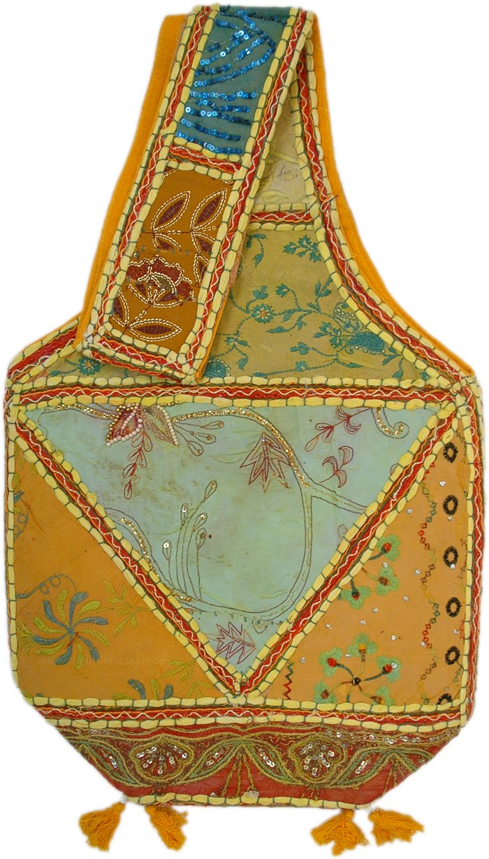 Gypsy side bag with sequin work and embroidered patchwork and it closes with a tie on the top. This cool sling bag has a broad strap and in fully lined from the inside with black fabric. Beautiful embroidery and sequin work is done on the patches that are stitched in the applique form, with shades of yellow.